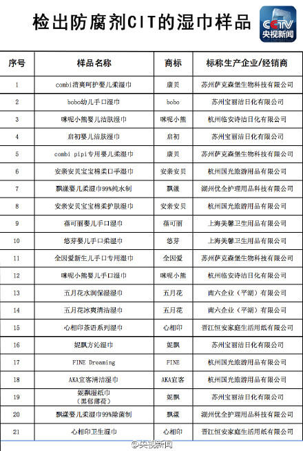 上海市消保委昨日发布的上海市流通领域湿巾比较试验结果显示,50件样品中有21件测出了防腐剂CIT,检出率达42%。