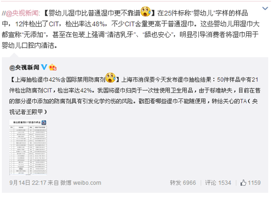 上海市消保委指出,这主要是因为国内湿巾产品的标准缺失导致,呼吁应按照国际标准,将湿巾作为化妆品管理,而不是仅仅作为一次性卫生用品看待。